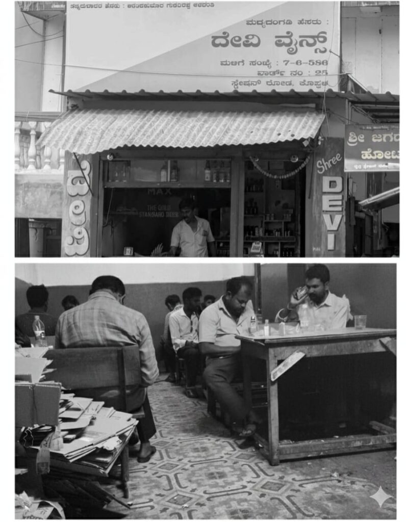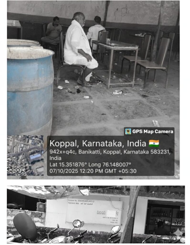 ಈಶ್ವರ್ ವೈನ್ಸ್ (CL-2), ಕೊಪ್ಪಳ: ಈ ಮಳಿಗೆಯು ಕರ್ನಾಟಕ ಅಬಕಾರಿ ನಿಯಮಗಳು, 1968 ರ ನಿಯಮ 5(2) ರಲ್ಲಿನ ಕಡ್ಡಾಯ ಷರತ್ತಾದ “ಸ್ಥಳದಲ್ಲಿ ಮದ್ಯಪಾನಕ್ಕೆ ಅವಕಾಶವಿಲ್ಲ” ಎಂಬ ನಿಯಮವನ್ನು ನಿರ್ದಯವಾಗಿ ಉಲ್ಲಂಘಿಸಿದೆ. ಈ ಮಳಿಗೆಯ ಪಕ್ಕದಲ್ಲಿ ಮೇಜು-ಕುರ್ಚಿಗಳ ವ್ಯವಸ್ಥೆ ಕಲ್ಪಿಸಿ, ಚಿಲ್ಲರೆ ಮಾರಾಟದ ಪರವಾನಗಿಯನ್ನು ದುರುಪಯೋಗಪಡಿಸಿಕೊಳ್ಳುವ ಮೂಲಕ ಅಕ್ರಮ ಬಾರ್ (De-facto Bar) ನಡೆಸುತ್ತಿದೆ. ಈ ವರದಿಯೊಂದಿಗೆ ಲಗತ್ತಿಸಲಾಗಿರುವ ಫೋಟೋಗಳು (ಉದಾ: ಬಸವ ನಗರದ ಬಳಿ) ಮದ್ಯದ ಬಾಟಲಿಗಳೊಂದಿಗೆ ಮದ್ಯಪಾನ ಮಾಡುತ್ತಿರುವವರ ವಿಷಾದಕರ ದೃಶ್ಯಗಳನ್ನು ಸ್ಪಷ್ಟವಾಗಿ ಅನಾವರಣಗೊಳಿಸಿವೆ.