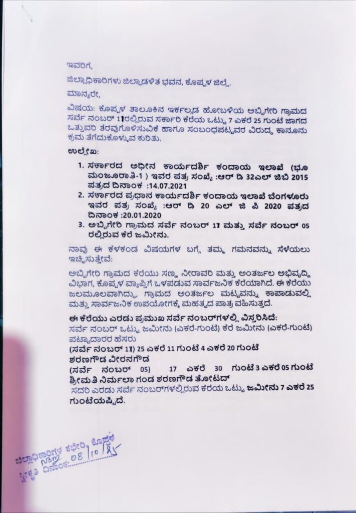 ದೂರಿನಲ್ಲಿ ಉಲ್ಲೇಖಿಸಿರುವಂತೆ, ಅಬ್ಬಿಗೇರಿ ಗ್ರಾಮದ ಸರ್ವೆ ನಂ. 11 ಮತ್ತು ಸರ್ವೆ ನಂ. 05 ರ ಸರ್ಕಾರಿ ಕೆರೆ ಜಮೀನು, ಒಟ್ಟು 7 ಎಕರೆ 25 ಗುಂಟೆ ವಿಸ್ತೀರ್ಣವನ್ನು ಹೊಂದಿದೆ. ಈ ಜಮೀನು ಸಣ್ಣ ನೀರಾವರಿ ಉದ್ದೇಶಕ್ಕೆ ಮೀಸಲಾಗಿದ್ದು, ಗ್ರಾಮದ ಜಲ ಸಂಪನ್ಮೂಲಕ್ಕೆ ನಿರ್ಣಾಯಕವಾಗಿದೆ.