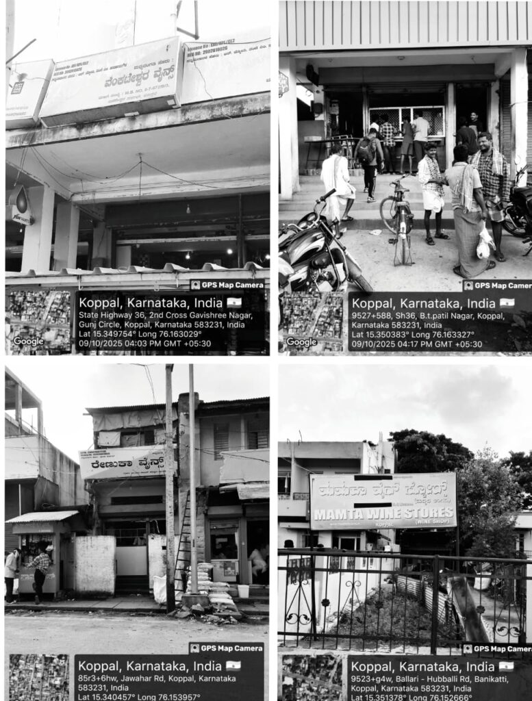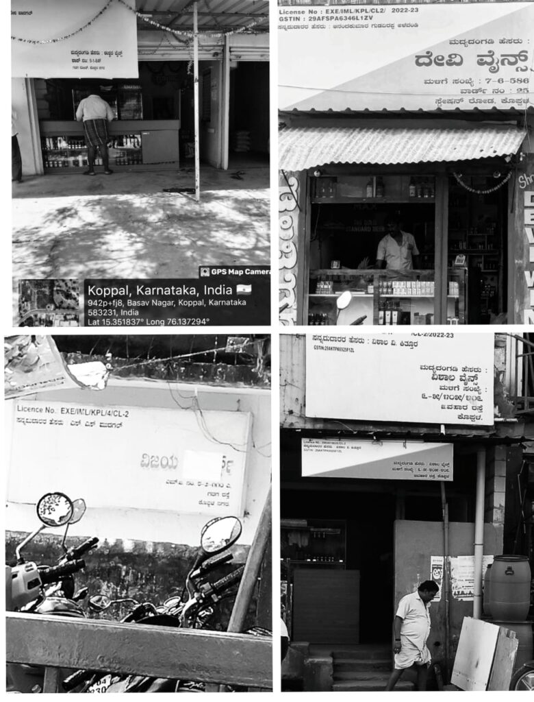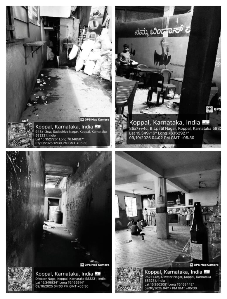 ಗಬ್ಬುನಾರುತ್ತಿರುವ ಅನೈರ್ಮಲ್ಯ: ಇದಕ್ಕಿಂತಲೂ ಘೋರ ಸಂಗತಿಯೆಂದರೆ, ಈ ಅಂಗಡಿಗಳ ಸುತ್ತಲಿನ ಪರಿಸರವನ್ನು ವೈನ್ ಶಾಪ್ಗಳು ಮಾಡಿರುವ ಅತಿಕ್ರಮಣ ಮತ್ತು ಅನೈರ್ಮಲ್ಯದಿಂದಾಗಿ ಶೌಚಾಲಯಕ್ಕಿಂತಲೂ ಹೆಚ್ಚು ಗಬ್ಬುನಾರುತ್ತಿದೆ. ಮದ್ಯಪಾನ ಮಾಡುವವರು ರಸ್ತೆಯಲ್ಲೇ ಮೂತ್ರ ವಿಸರ್ಜನೆ ಮಾಡುವುದು, ಖಾಲಿ ಬಾಟಲಿಗಳು, ಪ್ಲಾಸ್ಟಿಕ್ ಲೋಟಗಳು ಮತ್ತು ತಿಂಡಿಯ ಕಸವನ್ನು ಎಲ್ಲೆಂದರಲ್ಲಿ ಬಿಸಾಡುವುದರಿಂದ ಸಾರ್ವಜನಿಕರಿಗೆ ಓಡಾಡಲು ಅಸಾಧ್ಯವಾಗಿದೆ. ಈ ವೈನ್ಶಾಪ್ಗಳು ಸುತ್ತಮುತ್ತಲಿನ ನಿವಾಸಿಗಳ ನೆಮ್ಮದಿಯನ್ನು ಸಂಪೂರ್ಣವಾಗಿ ಕಸಿದುಕೊಂಡಿವೆ.ಈ ಅಂಗಡಿಗಳು ವಾಸ್ತವವಾಗಿ ಪರವಾನಗಿ ಇಲ್ಲದ CL-7 (ಬಾರ್ ಮತ್ತು ರೆಸ್ಟೋರೆಂಟ್) ಮಾದರಿಯಲ್ಲಿ ಕಾರ್ಯನಿರ್ವಹಿಸುತ್ತಿವೆ. ಕೊಪ್ಪಳ ಶೀಘ್ರದಲ್ಲೇ ಒಂದು ‘ಮದ್ಯಪಾನಗಳ ಅಕ್ರಮ ಗೋದಾಮು’ ಎಂಬ ಕುಖ್ಯಾತಿಗೆ ಒಳಗಾಗುವುದರಲ್ಲಿ ಸಂಶಯವಿಲ್ಲ.