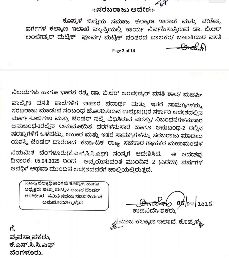 ಕೊಪ್ಪಳ ಜಿಲ್ಲೆಯ ಸಮಾಜ ಕಲ್ಯಾಣ ಮತ್ತು ಪರಿಶಿಷ್ಟ ವರ್ಗಗಳ ಕಲ್ಯಾಣ ಇಲಾಖೆಯ ವಸತಿ ನಿಲಯಗಳಿಗೆ ಆಹಾರ ಸಾಮಗ್ರಿಗಳ ಸರಬರಾಜಿನ ಕುರಿತ ಘೋರ ಅಕ್ರಮಗಳು ಇಂದು ಬಯಲಾಗಿವೆ. ದಿನಾಂಕ 05/04/2025 ರಿಂದ ಎರಡು ವರ್ಷಗಳ ಅವಧಿಗೆ ಗುತ್ತಿಗೆ ಪಡೆದ ಕೆ.ಎಸ್.ಸಿ.ಸಿ.ಎಫ್., ಬೆಂಗಳೂರು ಸಂಸ್ಥೆಯು, ಕಾರ್ಯಾದೇಶದ ಅಧಿನಿಯಮಗಳನ್ನು ಸಂಪೂರ್ಣವಾಗಿ ಗಾಳಿಗೆ ತೂರಿ, ವಿದ್ಯಾರ್ಥಿಗಳ ಹಕ್ಕನ್ನು ಕಗ್ಗೊಲೆ ಮಾಡಿದೆ ಎಂಬುದು ರಣ ಬೇಟೆ ತಂಡದ ತನಿಖೆಯಲ್ಲಿ ದೃಢಪಟ್ಟಿದೆ.